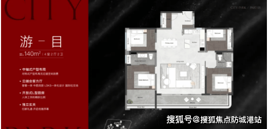 户型三:建面约140㎡四房两厅两卫(高端改善户型) 布局:该户型采用大宽厅设计,四开间朝南,空间开阔大气,动静分区清晰,客厅、餐厅、阳台相连,卧室集中分布在户型内侧,私密性强,适合高端改善人群与多人口家庭居住。 面积与房间数量:建面约140㎡,四房两厅两卫,空间充裕,每一间卧室都有充足的使用空间,其中主卧为套间设计,配备独立卫生间、衣帽间与书房,同时包含3间次卧,可满足三代同堂+多孩家庭的居住需求,空间利用率高达96%。