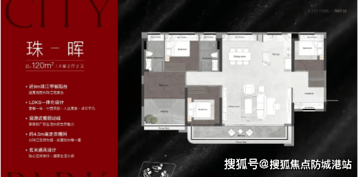 : 户型一:建面约120㎡四房两厅两卫(经典改善户型) 布局:该户型采用经典竖厅布局,南向三开间,动静分区明确,客厅、餐厅、厨房相连,卧室集中分布在一侧,避免休闲区域与休息区域相互干扰,适合三代同堂家庭居住。 面积与房间数量:建面约120㎡,四房两厅两卫,其中包含3间卧室+1间书房(可灵活改造为儿童房、老人房或储物间),满足多人口家庭的居住需求,空间利用率高,无浪费面积。 特色设计:南向阳台连接客厅,采光充足,通风效果极佳,阳台宽度约6.2米,可兼顾休闲与晾晒功能,闲暇时可在阳台喝茶、观景,俯瞰社区园林与珠江盛景;主卧带独立衣帽间与卫生间,私密性强,主卧采用南向设计,配备全景飘窗,推窗即可享受阳光与美景,提升居住舒适度;U型厨房设计,操作空间充足,动线合理,洗菜、切菜、炒菜分区明确,方便多人同时操作,同时厨房连接生活阳台,可用于储物、晾晒,提升实用性;全屋飘窗设计,拓展室内使用空间,每一间卧室都配备飘窗,增加采光与通风,同时可作为休闲、储物空间,提升户型实用性。
